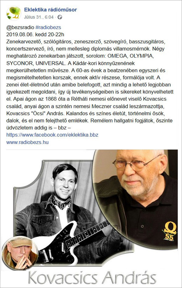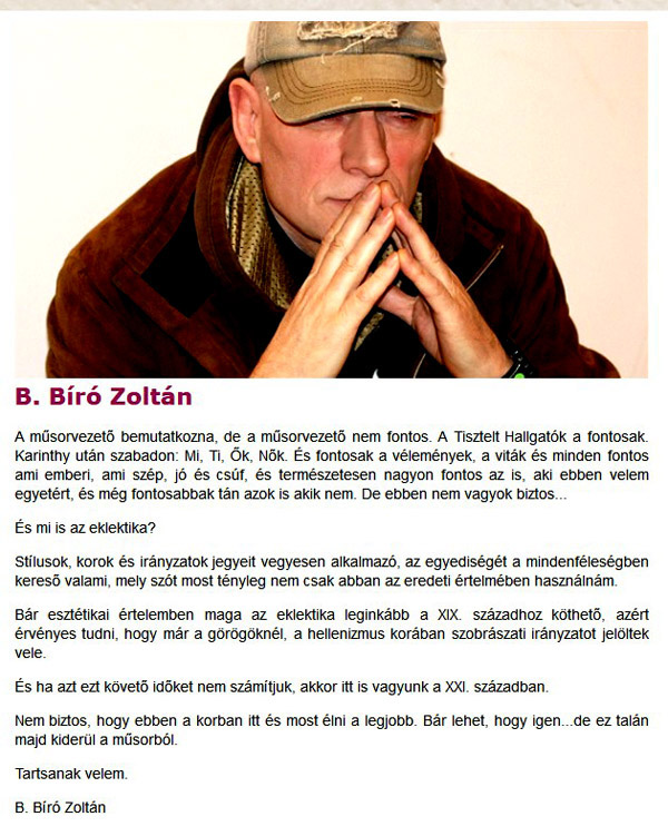 Ismét megcsörrent a telefon, benne B Bíró Zoltán. Zoli korabeli zenésztársam, sőt azt is tisztáztuk, hogy közös zenekarunk is volt, én váltottam a Rodeo trióban, ahol Rosta Gézával és G. Sándor Jánossal zenéltünk, érdekes viszont, hogy - ennyi idő elteltével - csak most találkoztunk először személyesen. Rendkívül jól felkészült műsorvezető, élmény volt vele beszélgetni. Ezen kívül minden egymaga oldott meg az interjú alatt, hangkeverést, zeneszámok bejátszását és csak ketten voltunk a stúdióban, sőt még az egész rádióban is. |