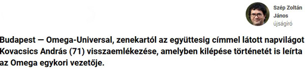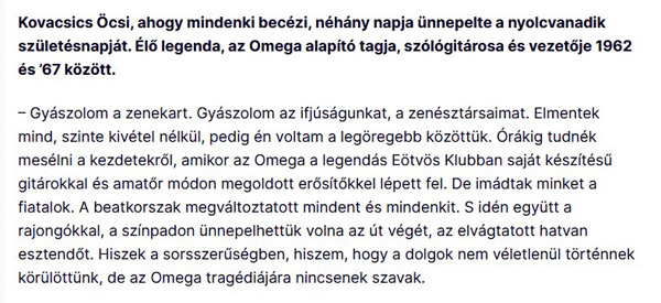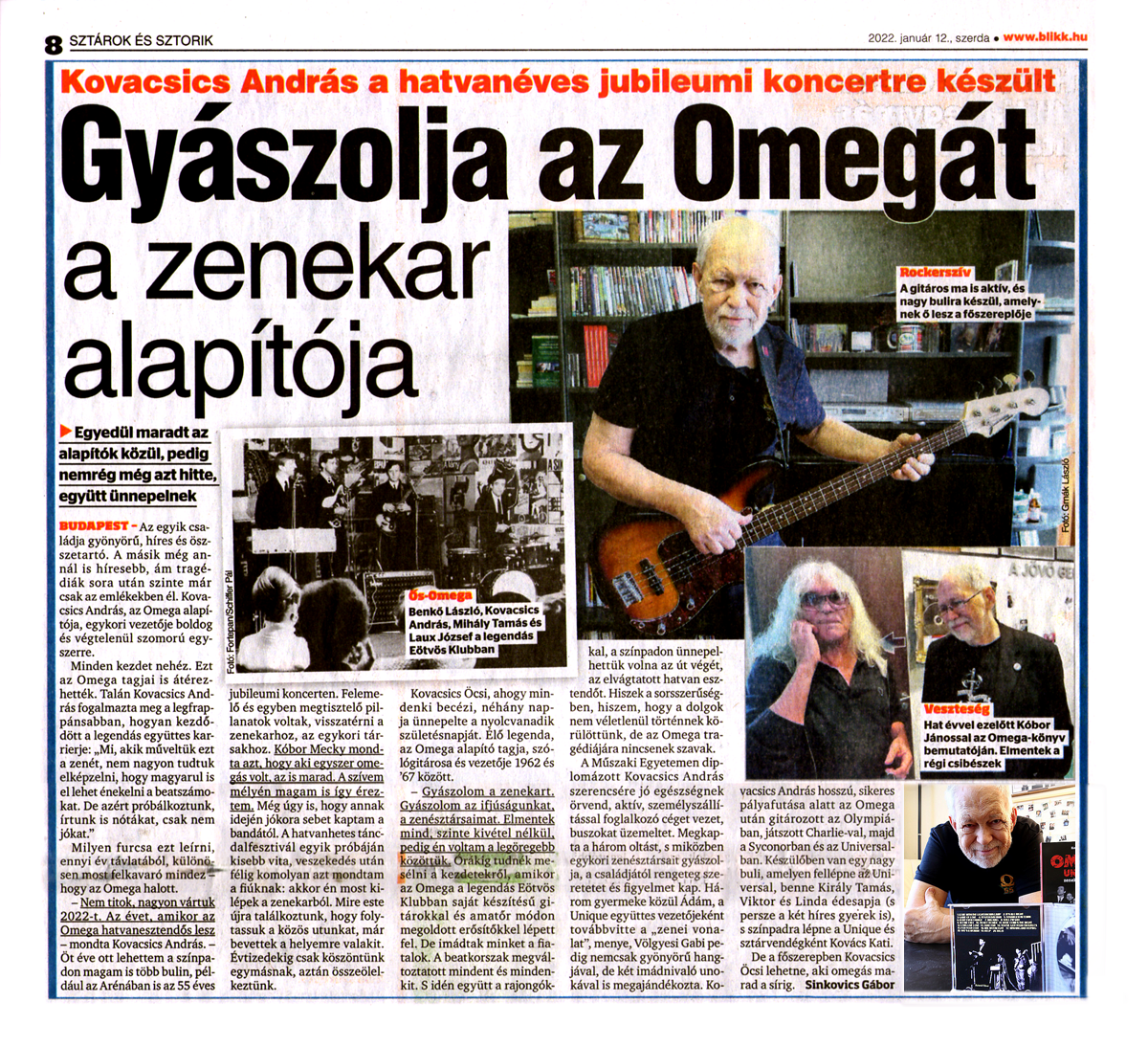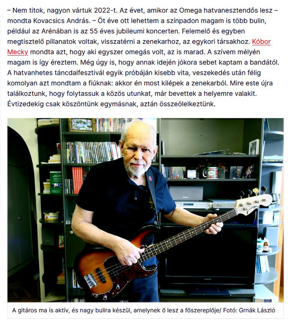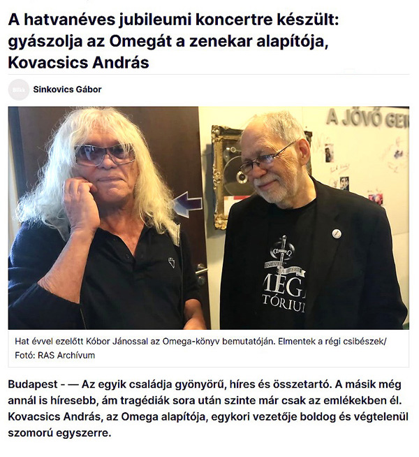 - Erre végül nem volt szükség, elmentem magamtól. Nem értettük meg egymást zeneileg, de ez miattam volt. Engem akkor már, és azóta is csak a dzsessz érdekelt - emlékezett Tornóczky, aki azok közé tartozik, aki látta színpadon a Próféta együttest Benkő Lászlóval és Kóbor Jánossal. Bánkúti távozása után ugyanis nevet változtattak, de örök rejtély marad, hogy kitől származik az Omega elnevezés. Az együttes október 6-án egy koncerttel ünnepli az Arénában.
