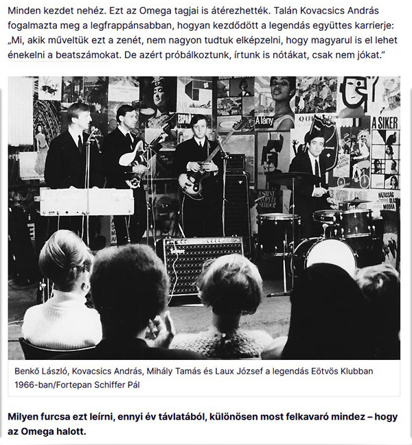 - Folytatni akartuk, mert hittünk a beatzenében, de azt is tudtuk, ehhez tagcserékre, és OSZK-engedélyre lesz szükség - emlékezett Benkő László. Bizony, a tánczenészeknek az Országos Szórakoztatózenei Központ (OSZK) biztosai előtt kellett igazolni: keringőt, és rumbát is tudnak játszani. Csak így járt nekik gázsi, amatőrként jelképes fellépti díjat kaphattak. Az Omega tagjai első sorban műegyetemisták voltak, nem képzett muzsikusok, ezért ódzkodtak a profivá válástól. |