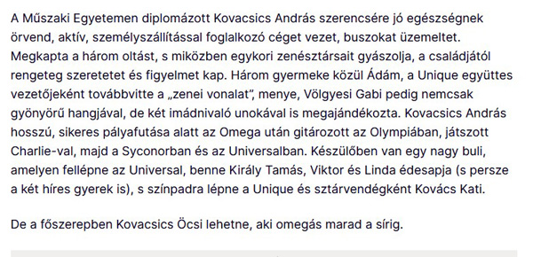 - Láng Peti távozása után az ismeretlen Harmath Laci ajánlkozott szaxofonosnak. Örömmel fogadtuk, de hamarosan lehangolódtunk, ugyanis levelet küldött az OSZK - emlékezett Benkő. - Az állt benne, változott a szabályozás, már csak engedéllyel lehet színpadra lépni. Nem volt más választásunk, vállalnunk kellett a vizsgát - tette hozzá a billentyűs, aki sosem felejti, ami ekkor történt. - Alig kezdtük meg a csörömpölést, a három biztos felállt, és látni lehetett az arcukon, itt most mindennek vége. Leálltunk, és teljesen elkeseredtünk, de ekkor Harmath Laci megszólította őket. Azt mondta, szólna az apjának, hogy jobb körülmények közt vizsgáz- hassunk. Így derült ki, hogy az apukája vezető beosztásban van az OSZK-nál. El is intézte az engedélyt - mondta kaján mosollyal Benkő, aki ezután átalakította az Omegát. Künsztler Tomi helyére jött a profi dobos Laux József, akit Kóbor János, és Varsányi István még a József Attila gimiből ismert, Wittek Mari személyében pedig rátaláltak a tökéletes énekesnőre. Amikor Harmath Lacit behívták katonának, Laux ajánlotta a helyére szaxofonosnak Somló Tamást. Együtt volt a csapat, és vették is az első akadályt. |