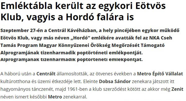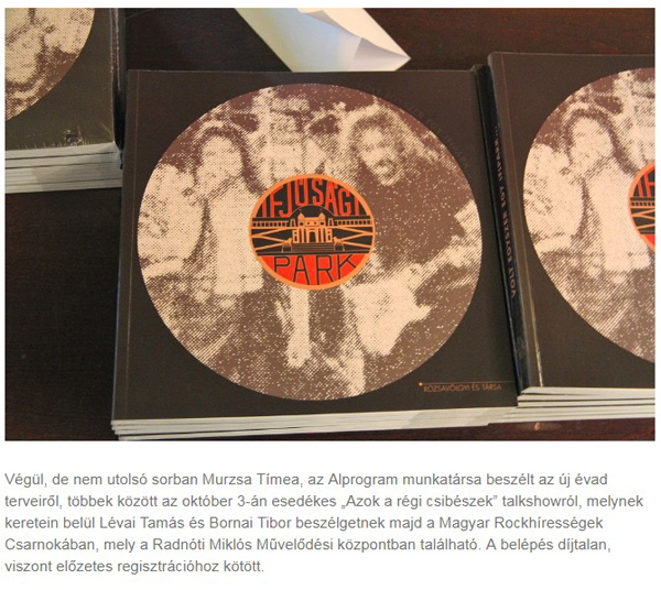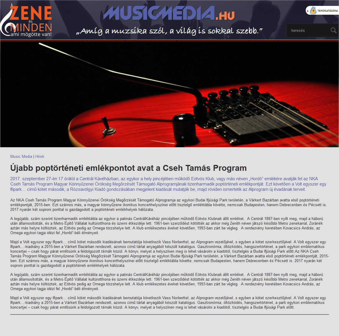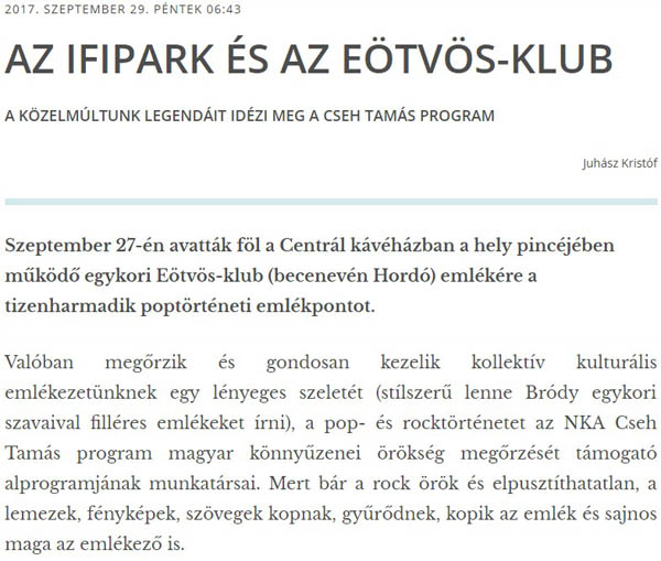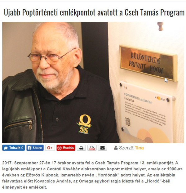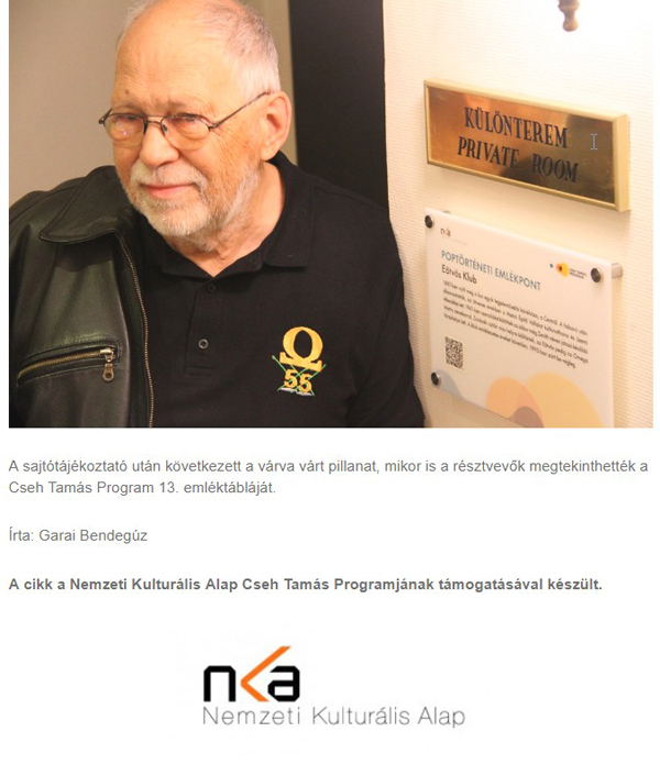 Az esemény az emeleten került megrendezésre, kedves fogadtatás volt meleg pogácsával, innivalóval. Az NKA Cseh Tamás Program Magyar Könnyűzenei Örökség Megőrzését Támogató Alprogramjának tizenharmadik poptörténeti emlékpontjának avatása történt meg a Hordóban, Murzsa Tímea képviselte a céget a rendezvényen, mellettem az Alprogram koordinátora Vass Norbert nyitotta meg a rendezvényt. |