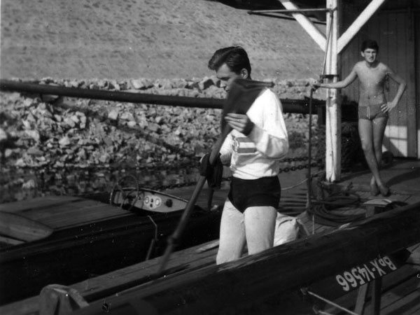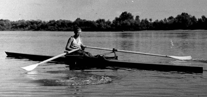 Itt már 14 évesen - önállóan szkiff-ben - egypárevezősben még mindig a Római parton, a Magyar Nemzeti Bank hajójával. Nagy választék volt Sportegylet hajóparkjából, ekkor már megkaptuk a legmagasabb minősítést és bármelyik hajóban evezhettünk. |