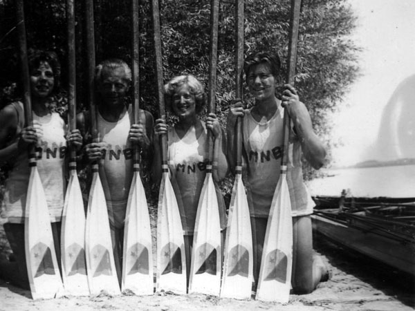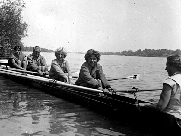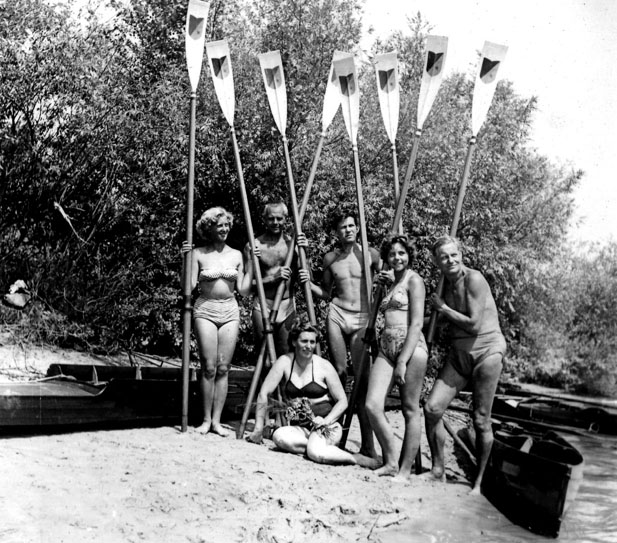 Találtam egyet, egy kivételes fényképet, amikor az egész család egy kormányos négypárevezősben evezett a Magyar Nemzeti Bank vizi telepéről. Balról jobbra: |