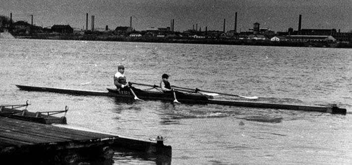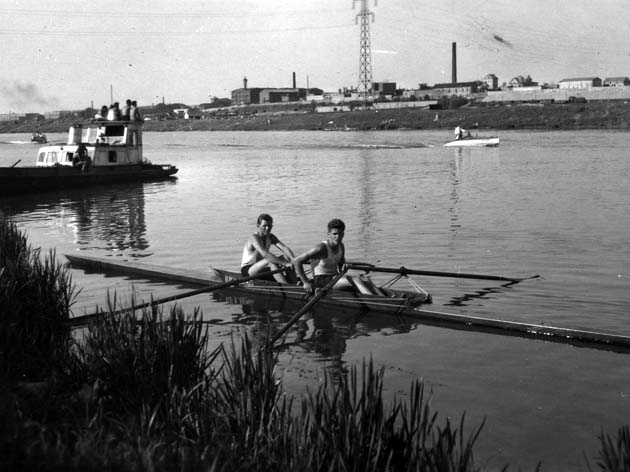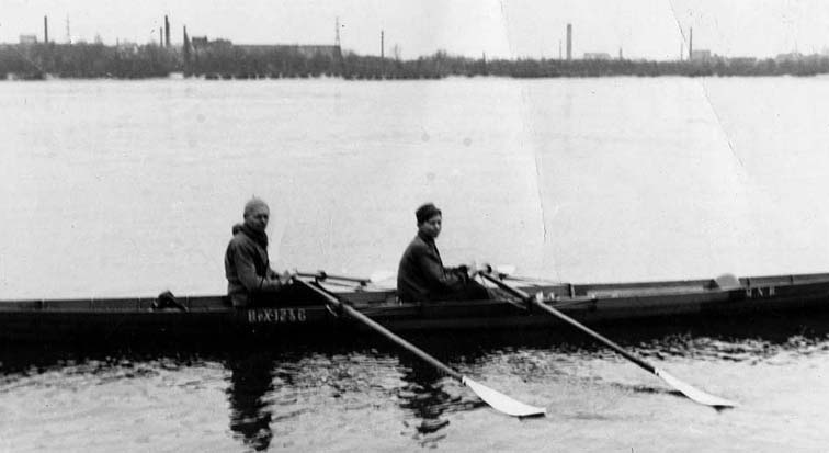 9 és fél évesen Édesapámmal evezek a Római Parton lábkormányos kétpárevezős- ben. Dubló, ez volt a hívatalios elnevezése ennek a hajónak. |