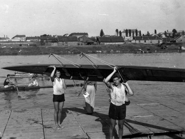 Már az elején szeretném tisztázni - akik nem annyira jártasak ebben a szakágban, - hogy az evezés nem tévesztendő össze a kajakozással! Konkrétan gurulóüléses, villával szerelt párevezős hajókról van szó, 26 cm széles, vásznazott kivitelben. Ezt nem úgy kell érteni, hogy olyan soványnak kellett lenni, mert a gurulóülés peremétől erősen szélesedett a palánk. Megjegyzem, van egyevezős változata is, de mi zömében párevezős hajókban húztunk. A lapátok olyan hosszúak, hogy csak egymás fölött lehetett elvinni és szabály szerint a bal kéz ment felül, eszerint van minden villa beállítva. |