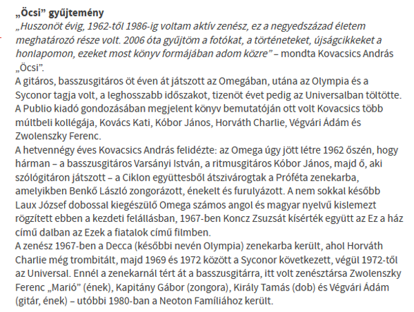 Most került kezembe a könyved és nagy érdeklődéssel olvastam. Nem titkoltan az Omegás időszakod érdekelt leginkább, de természetesen az OLYMPIA a SYCONOR (ettől a zenekarodtól emlékszem a Nézd milyen kicsi a felhő c. dalra, kis srác koromban sokat énekeltem).