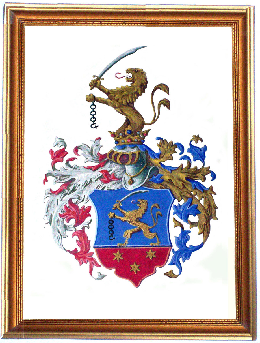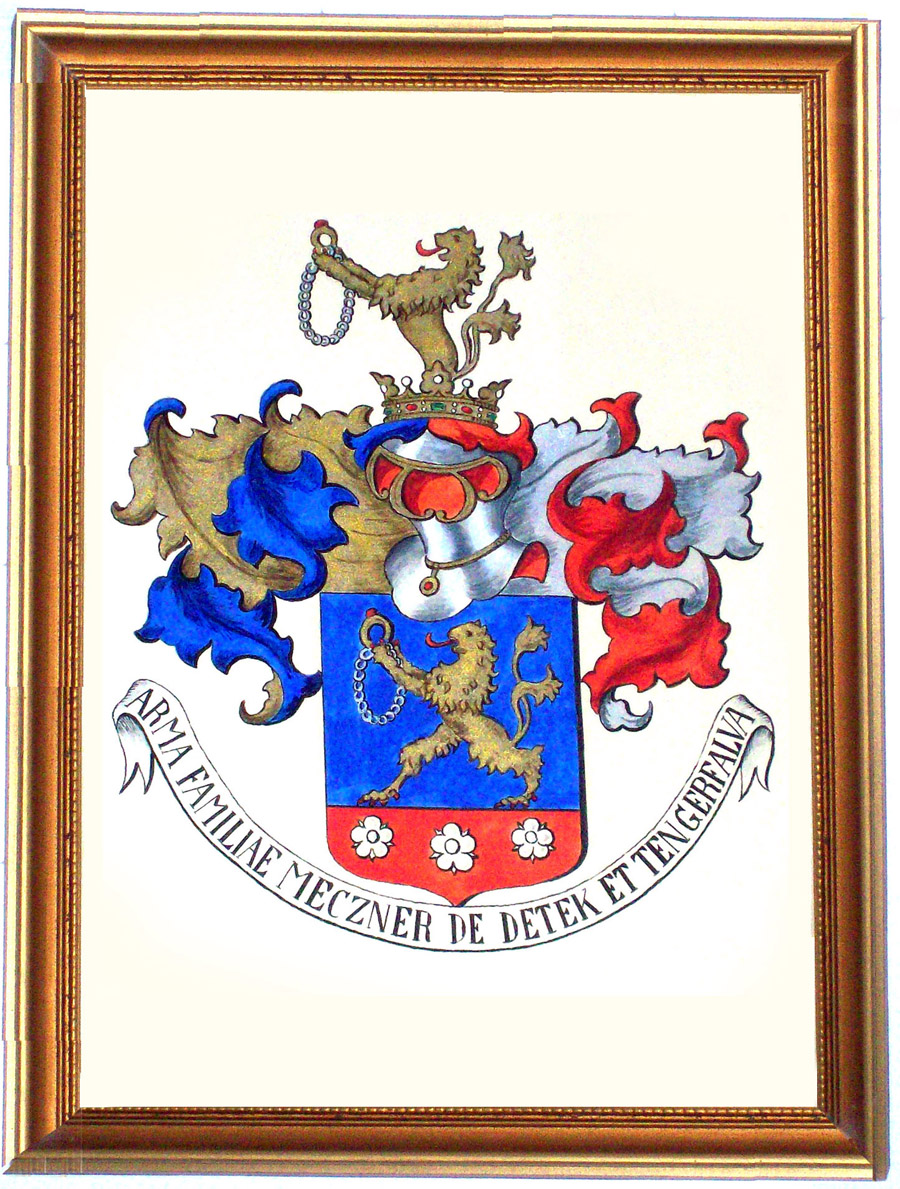 A Meczner címerünk másik változata is ismert számomra, itt az oroszlán kezében már kard szerepel, valamint részletgazdababb a kidolgozás. A hivatalos leírás is inkább erre a címerre illik. |