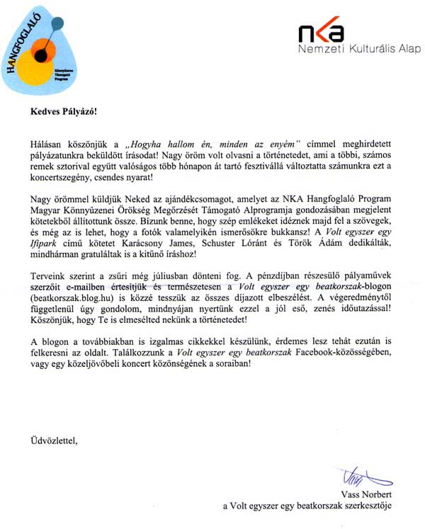 "Köszönjük szépen a remek sztorikat! Szívesen közölnénk a blogon az írását, és ez egyszersmind azt is jelenti, hogy küldenénk Önnek az ajándék köteteket, illetve, hogy az első három helyért is versenyezni fog! Az egyetlen apró bökkenő csak, hogy terjedelmileg egy kicsit túllóg a szöveg a meximálisan megengedhető 5.000 leütéses limiten. Nem szívesen zárnánk ki emiatt, mert tényleg közlésre érdemes, jó a szöveg, emiatt arra kérném, hogy amennyiben ez az Ön számára is elfogadható, szíveskedjen húzni egy kicsit a szövegből, hogy az ne lógjon 5.000 leütés fölé. Vass Norbert, szerkesztő" |