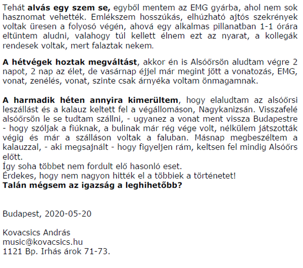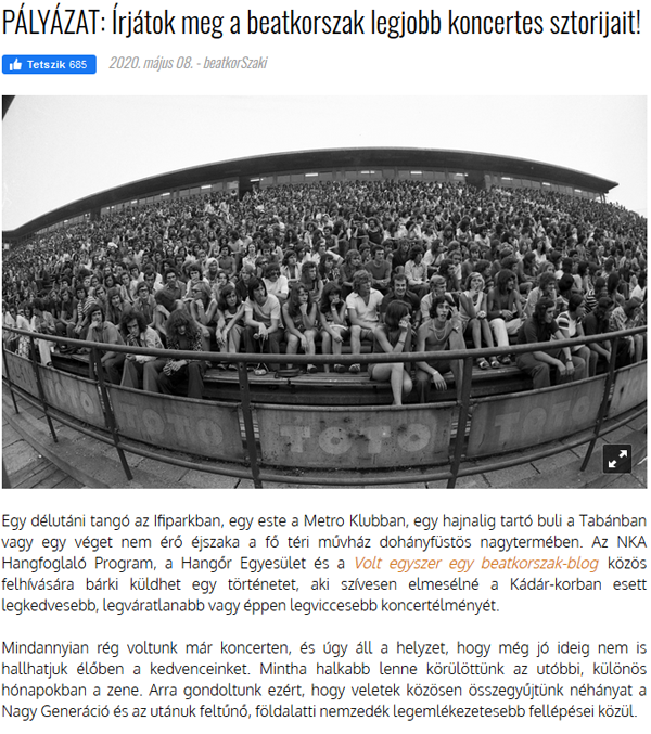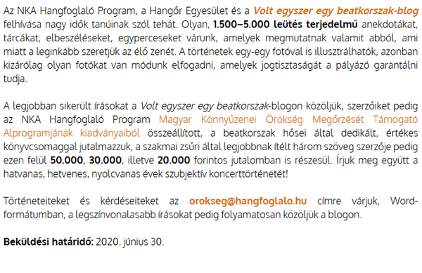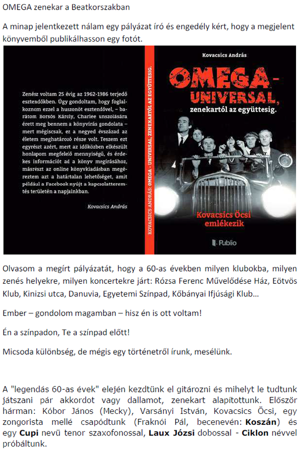 Kedves András! Örömmel írom, hogy mától olvasható a blogon a nekünk küldött története. Küldöm a linket: https://beatkorszak.blog.hu/2020/07/26/kalandjaim_az_omegaval_a_beatkorszakban Köszönjük szépen! üdvözlettel, Vass Norbert |