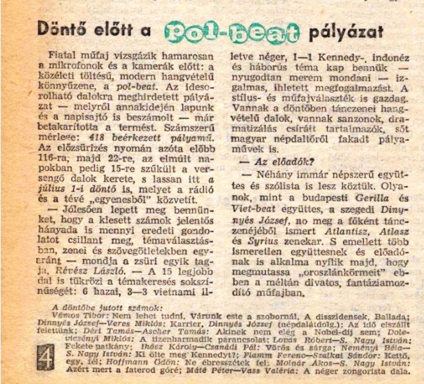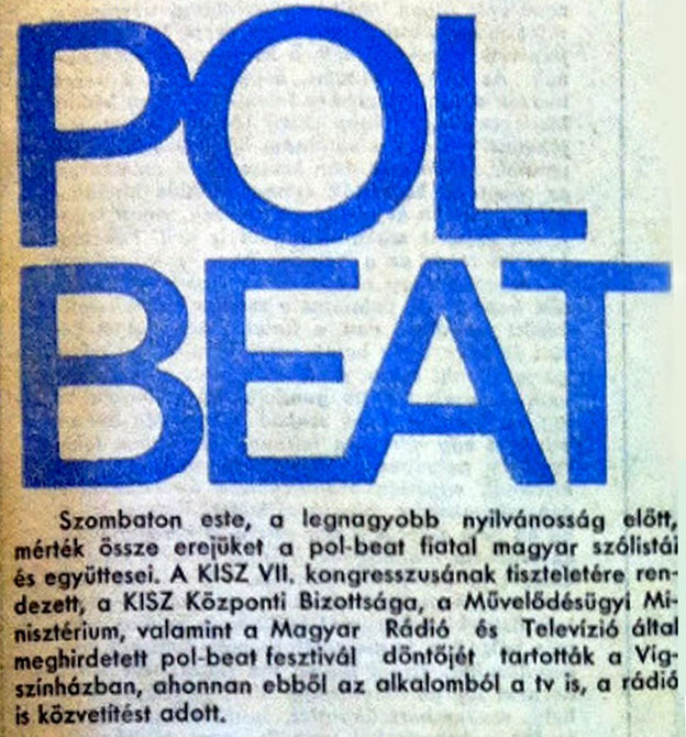 Az első magyar Pol-beat Fesztivál megrendezésére 1967 nyarán került sor. Ez az amatőr pol-beat kezdeményezés, mely nyugati mintát (Bob Dylan, Donovan) követett; az 1966-ban megrendezett első táncdalfesztivál sikere, a hasonló külföldi rendezvények valamint a pártvezetésnek azon törekvése, hogy a zenét a politika szolgálatába állítsa. |