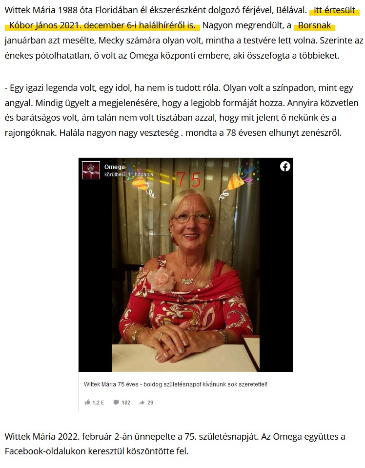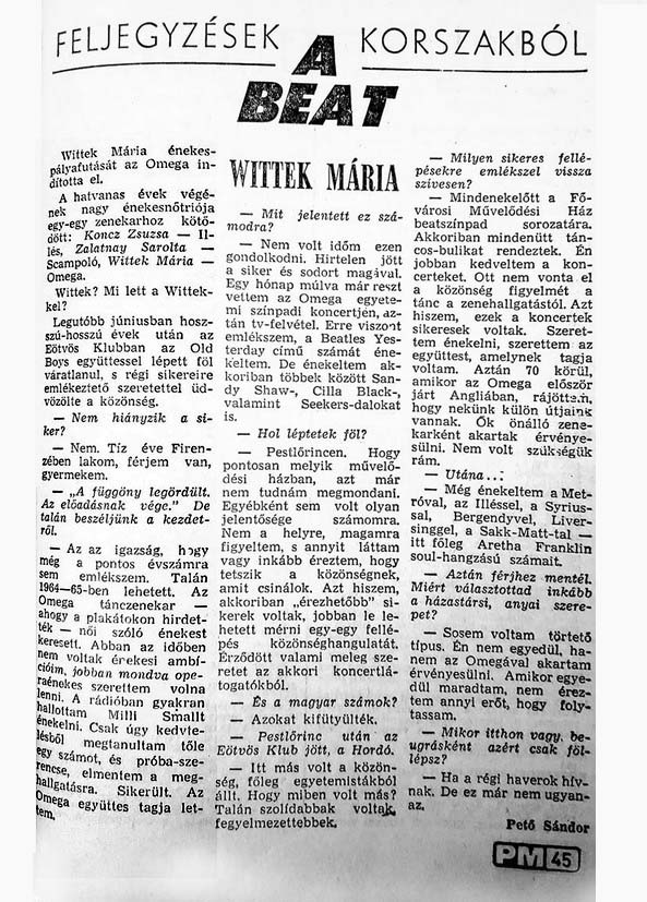 Szeretném a fiatalabbak és talán az idősebbek számára is Wittek Mari éneklését méltatni, helyére tenni, hiszen vele is szinte ugyanannyit zenéltem az Omegában, mint a fiúkkal és úgy érzem méltatlanul kezdik elfelejteni Magyarországon szerepét a beatzene hőskorában.