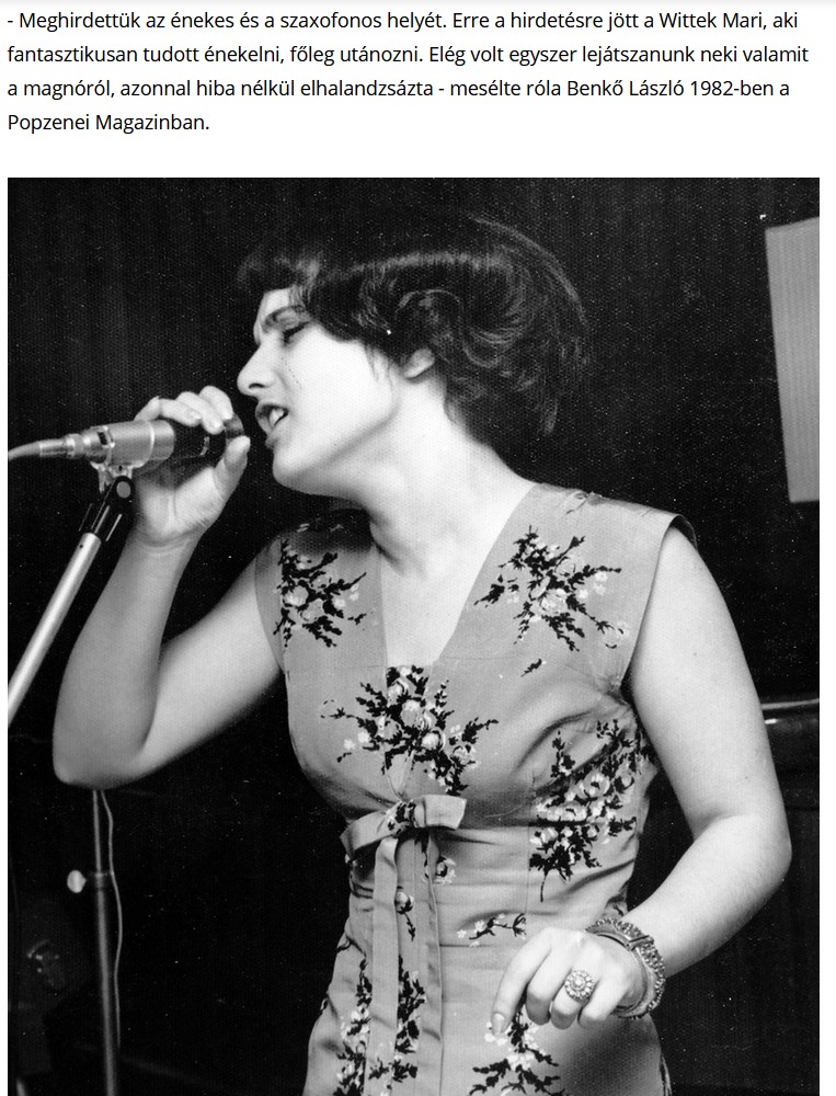 ...meghirdettük az énekes és a szaxofonos helyét. Erre a hirdetésre jött a Wittek Mari, aki fantasztikusan tudott énekelni, főleg utánozni. Elég volt egyszer lejátszanunk neki valamit a magnóról, azonnal hiba nélkül elhalandzsázta. Még Sonny and Chert is előadta, egyedűl! Közben lógott keze-lába, igazi kamasz fruska volt.