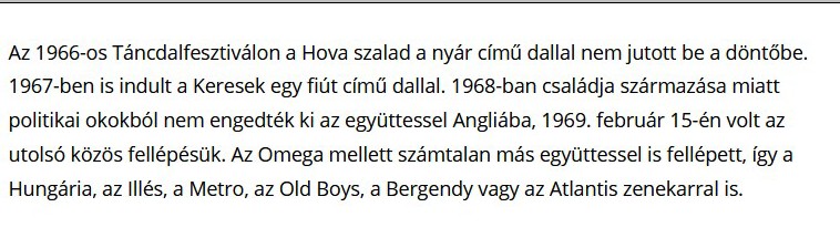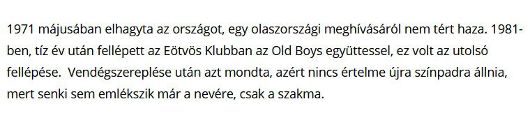 "1971 májusában hagytam abba magyarországi pályafutásomat. 1981-ben 10 év után felléptem az Eötvös Klubban az Old Boys együttessel. Nagy sikerem volt, mindenki eljött, aki szeretett engem. A Rádio felvette az egész műsort és interjút is készitettek velem, azt írták rólam, tehetsége semmit sem kopott, a közönség ugyan olyan szeretettel fogadta, mint régen".