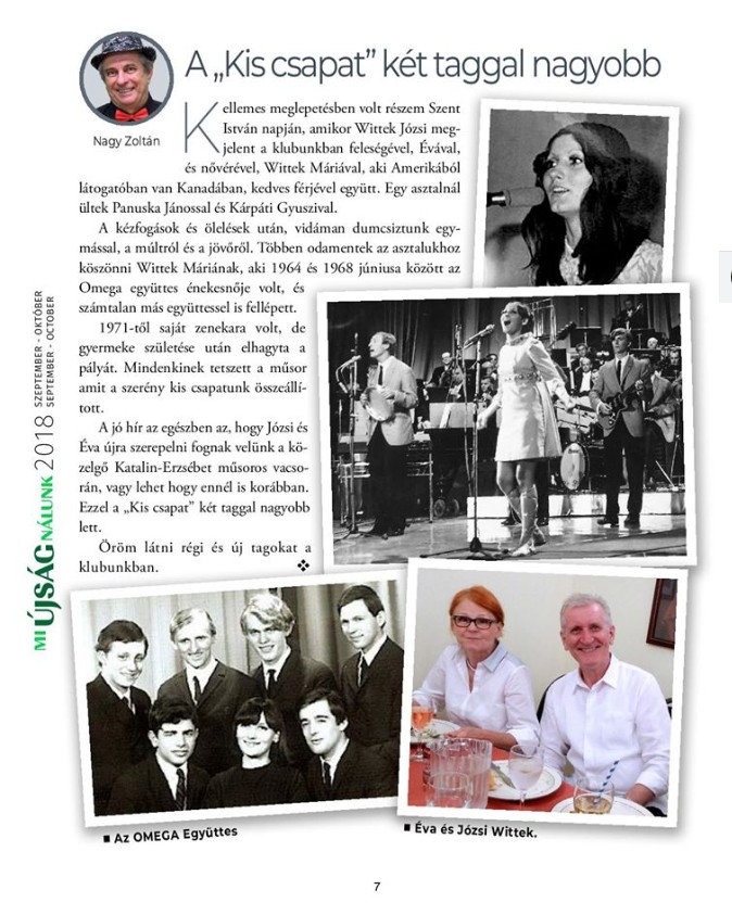 Wittek Mari öccse, Józsi - feleségéve, Évával - itthon volt Budapesten, együtt mentünk a budaörsi Omega koncertre, ahol a régi tagokkal főleg Meckyvel és Benkő Lacival szeretett volna találkozni. Józsi és Éva Viktóriában élnek, amit szinte észre sem veszünk, mert elég gyakorisággal beszélünk a Skype alkalmazással. |